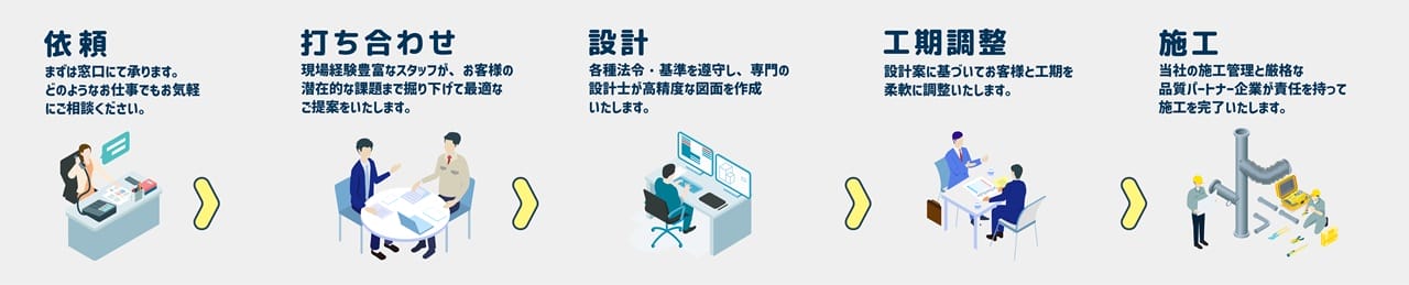 当社では各種管工事を中心に、設計・施工から申請対応、保守・メンテナンスまでを一貫して担う「管工事ソリューション」を提供しています。